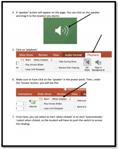 Step 2: Create audio for each page. I do this by recording myself reading the page/slide. You will need to click on the “audio” button. It is under the “insert” tab at the top. Then, click “record audio.” View the picture above, if needed.