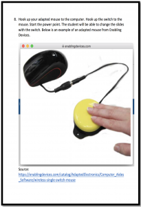 Step 8: Hook up your adapted mouse to the computer. Hook the switch to the mouse. Start the powerpoint. The student will be able to change the slides with the switch.