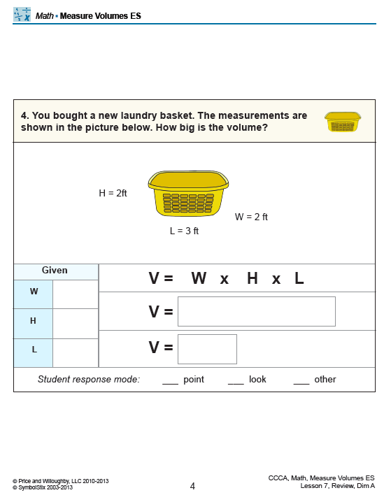 Measure Volume ES: Students will learn how to determine cubic centimeters, inches, or feet. They also learn to determine the volume of an object using a formula. The students are introduced to doing this in a step by step manner. They are led through these activities by the two characters Jake and Josie, two elementary school students. Each activity is completed on two different levels for differentiated instruction.