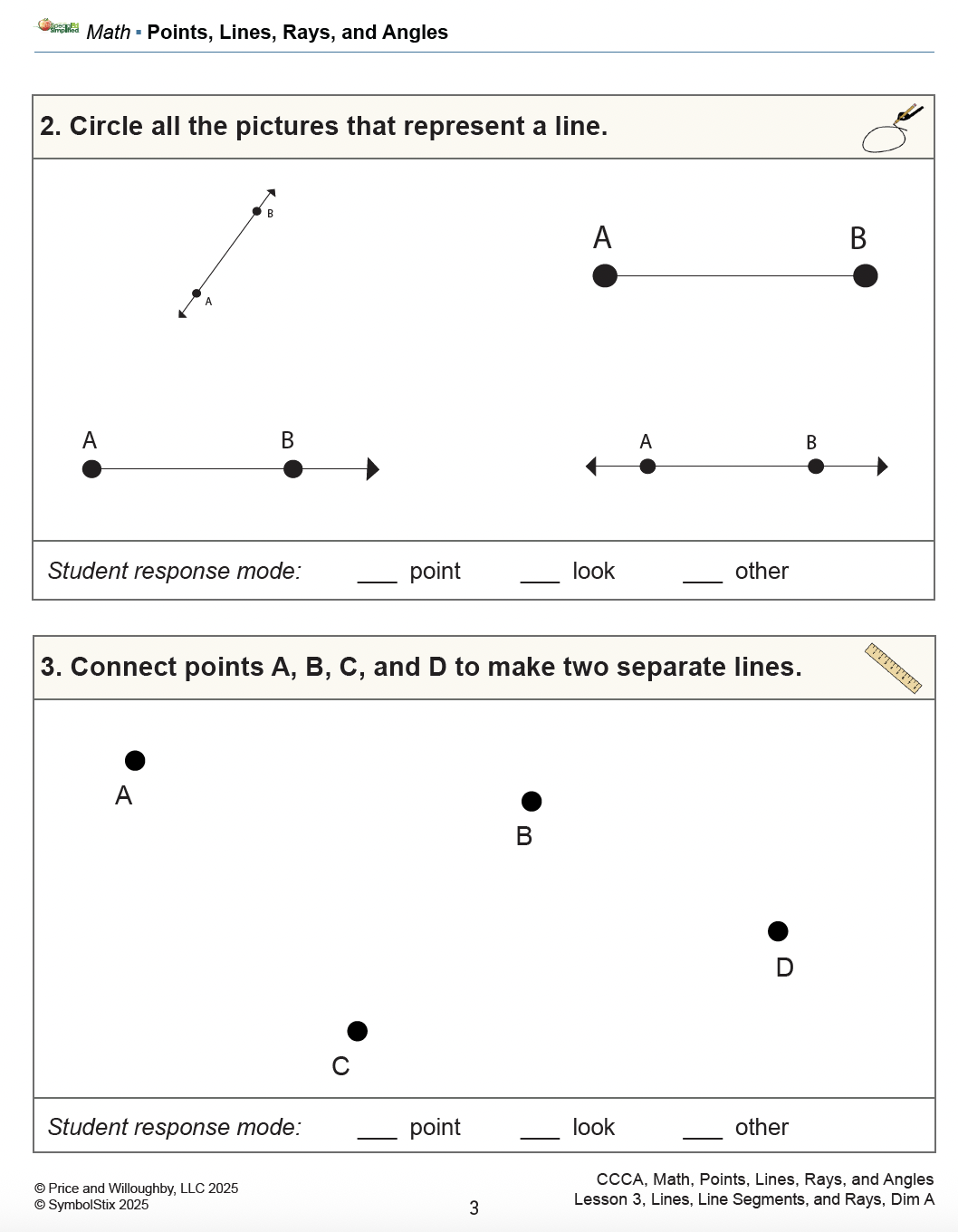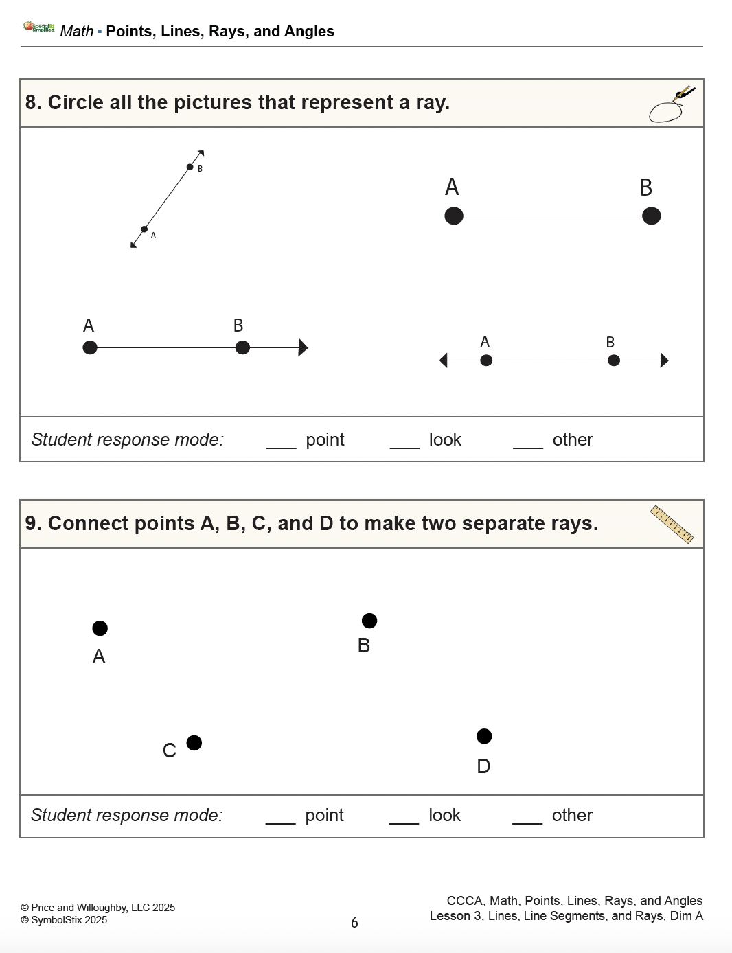 In these activities, students learn about points, lines, rays, and angles. Our characters help guide the lessons by offering simple explanations throughout the unit. Each lesson is completed on two levels (Dimension A and Dimension B) to support differentiated instruction for many learners.