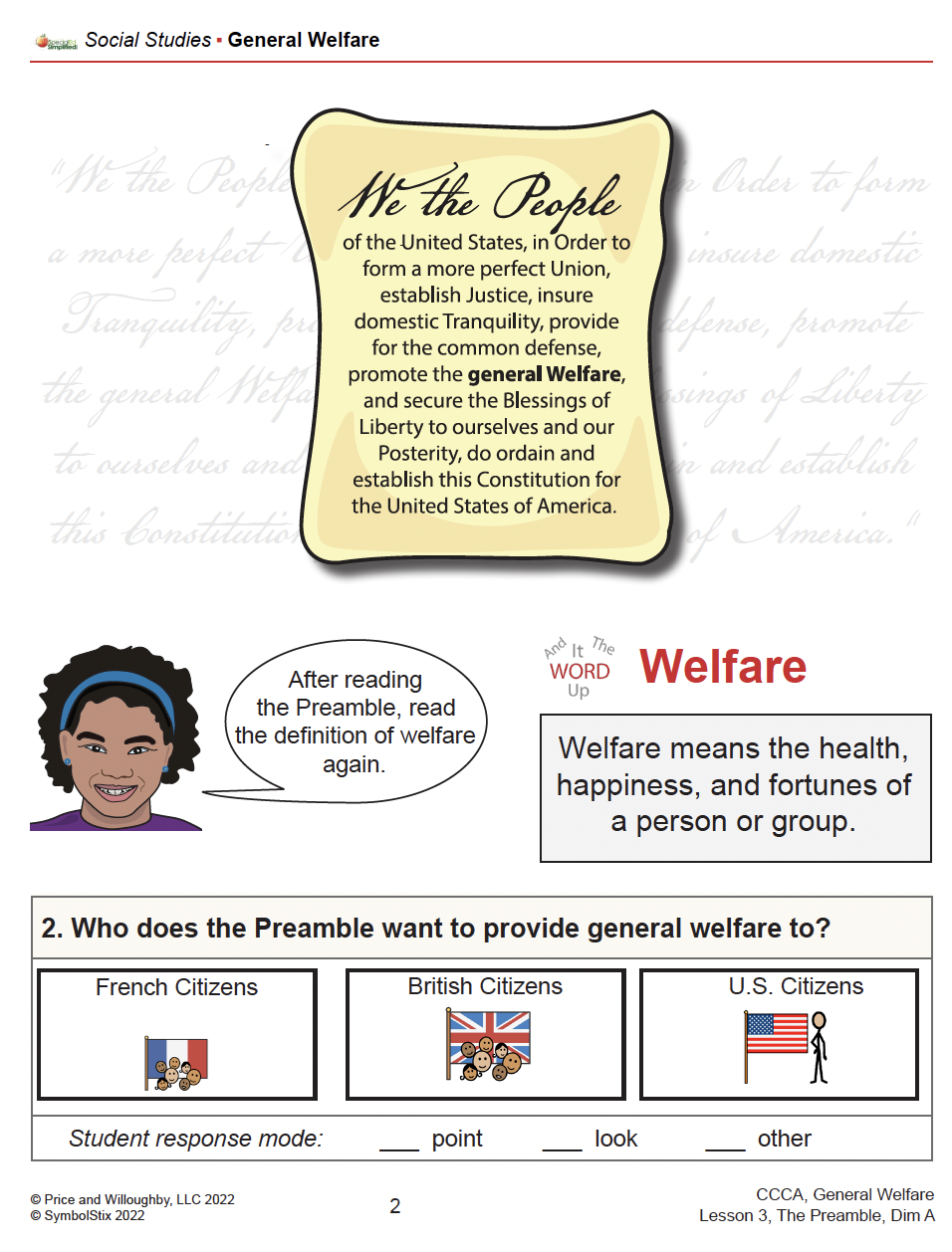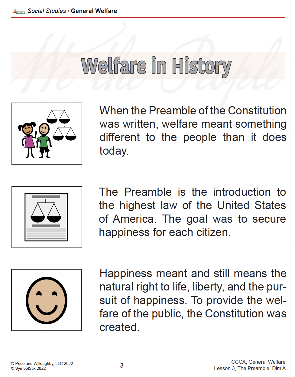 General Welfare: Students will evaluate whether various rules and laws promote the general welfare. They will gain an understanding what general Welfare meant in the past and what it means today.