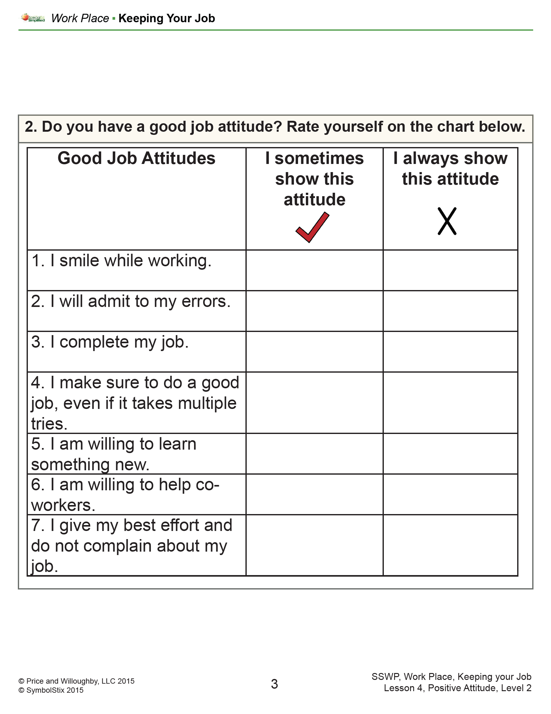 Keeping Your Job: In these activities, students begin to understand how they should dress, hygiene, being friendly, calls at work, and gossip at work. This unit helps students learn to be a good employee, understanding good work habits, benefits of a positive attitude, what to do when problems occur, attendance at work, and more.