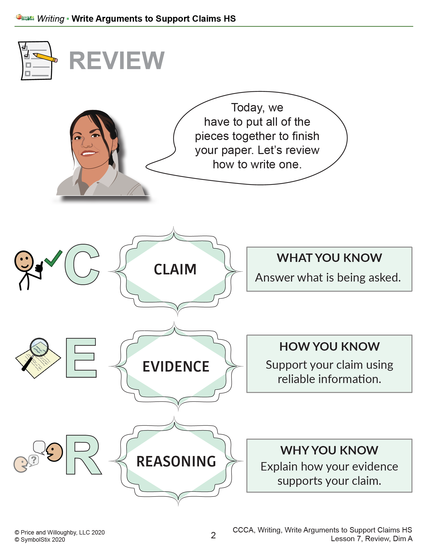 Write Argument to Support Claims: Students will work through different instructional strategies to complete a writing assignment. Students will write about what they know by answering what is being asked (claim), how they know it by supporting the claim (evidence), and why they know it by explaining how the evidence supports the claim (reasoning).